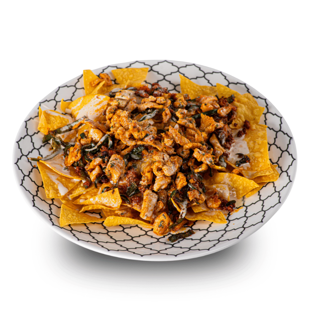 Chips topped with chargrilled chicken, chorizo, mushrooms, poblano peppers, covered…